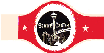 SEATTLE CENTER *(écriture blanche sur fond noir) (une tour panoramique, un gratte-ciel, un train aérien) |